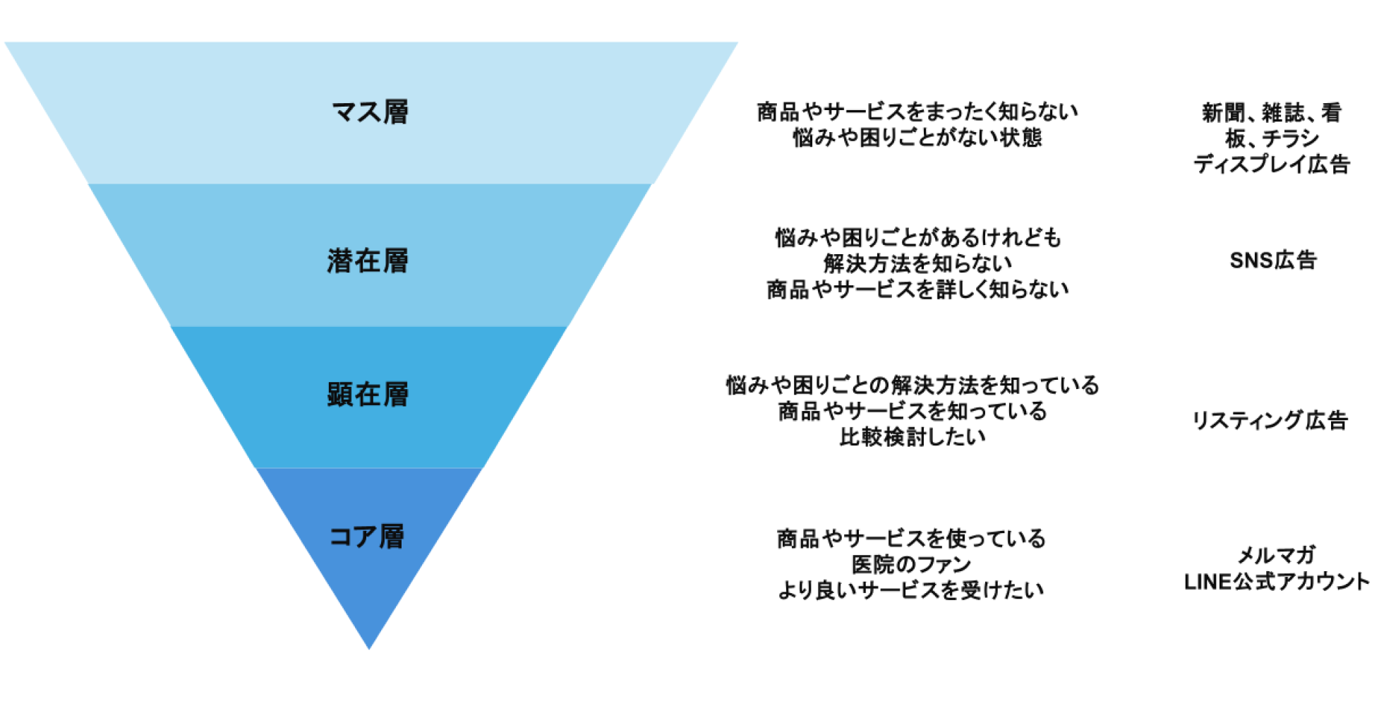 | マス層 | そもそもサービスの存在を知らない | ディスプレイ広告、CM、新聞、雑誌、看板、チラシ |